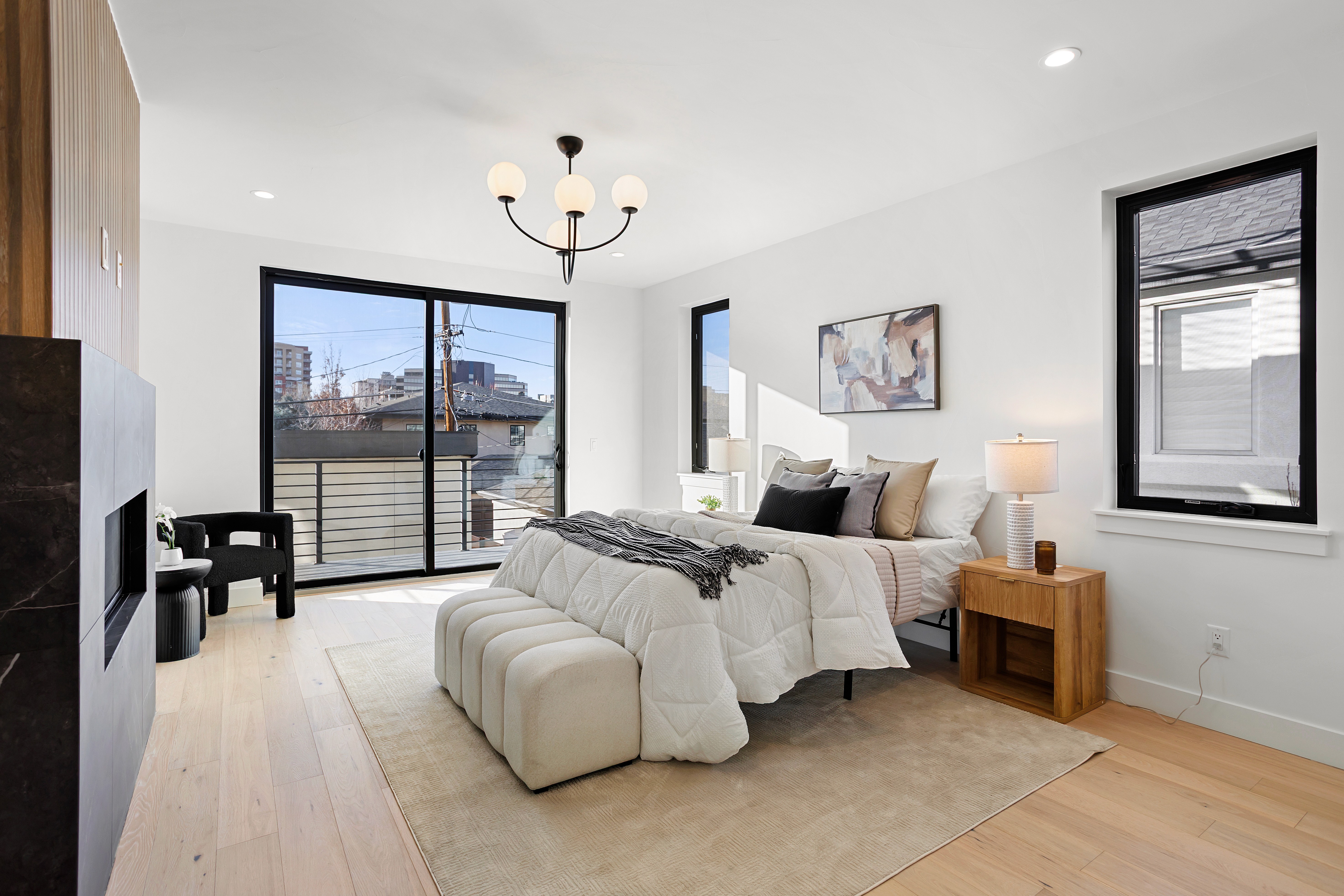 This five-bedroom, five-bath residence blends bold architecture with timeless finishes and expansive living spaces. Sun-filled interiors showcase wide-plank hardwood floors and an open layout anchored by a sleek gas fireplace. The chef-inspired kitchen features a large island, custom cabinetry, and a walk-in pantry ideal for entertaining. The luxurious primary suite offers a private balcony, fireplace, and spa-like bath with heated floors and a soaking tub. Additional bedrooms provide comfort and flexibility, with private baths and outdoor access. A rooftop level adds versatile space for work or relaxation with a wet bar and entertaining deck. The finished basement and private backyard complete this thoughtfully designed home with seamless indoor-outdoor living.